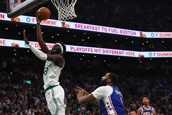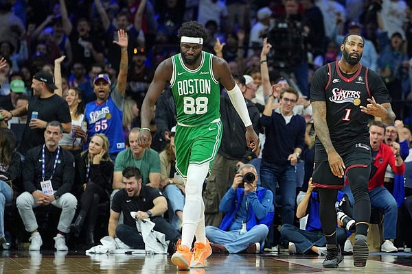 Os Boston Celtics dominaram os Philadelphia 76ers por 128-96, apesar do regresso de Joel Embiid, e estão a uma vitória das meias-finais da conferência.