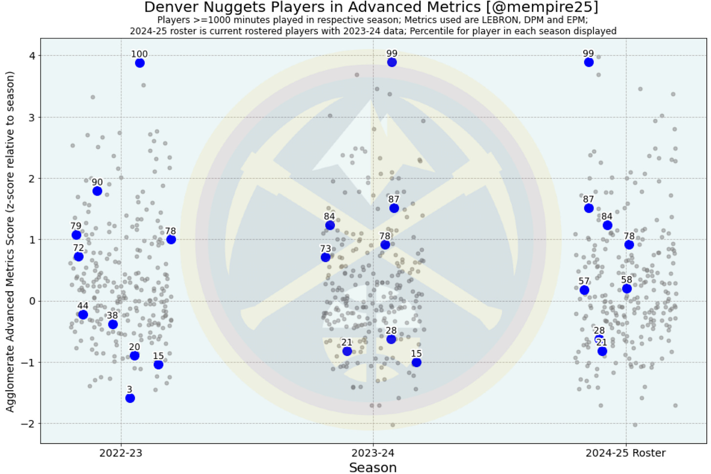 É importante lembrar que, para além de Jeff Green, nenhum jogador de relevo na rotação dos playoffs passava dos 30 anos de idade. Percebe-se assim o otimismo perante as chances dos Nuggets regressarem, quiçá múltiplas vezes, a este palco ao longo das épocas que se seguiam. No entanto, passados 15 meses da chuva de confetti, a equipa tem visto o talento disponível ficar cada vez mais limitado e já vão-se esbatendo as opiniões que anteveem 2024-25 tendo Denver no mais restrito inner circle de favoritos a repetirem o título de conferência.