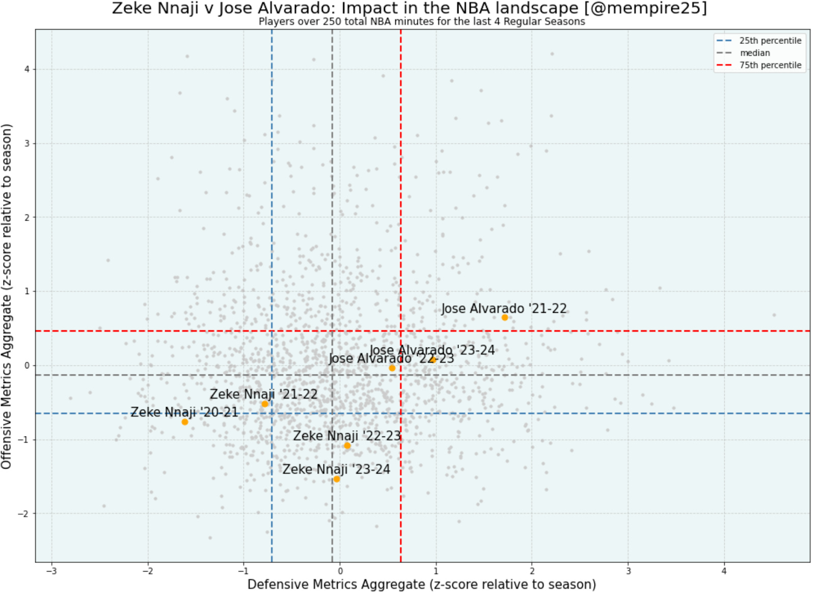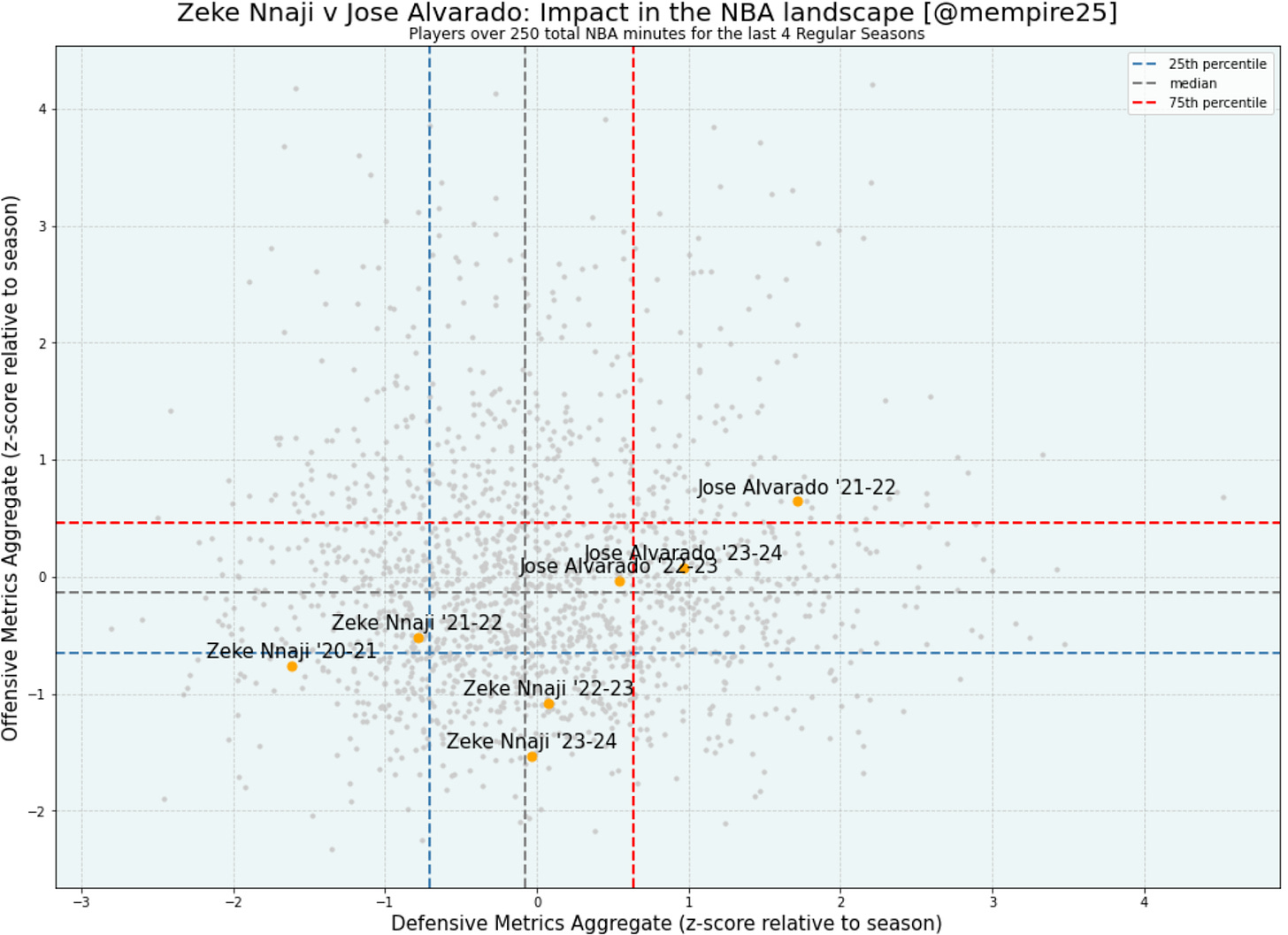 É necessário contextualizar este contrato, até porque o que ainda está para vir não pode ser separado deste momento e desta decisão. Postes suplentes com impacto posicional muito abaixo da média são jogadores de salários mínimos na NBA, mas Zeke Nnaji está prestes a iniciar uma época em que irá receber mais de três vezes esse valor. Jose Alvarado, um excelente base que faz parte do banco dos New Orleans Pelicans, acaba de renovar por metade deste valor anual e apenas por duas épocas. Isto é a comparação dos dois jogadores no que toca ao impacto medido pelas principais métricas avançadas (EPM, LEBRON e DPM):