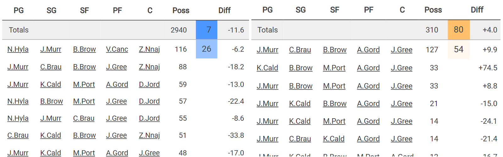 É possível que Zeke Nnaji seja um jogador anónimo para a maioria das pessoas que estão a ver jogos dos Denver Nuggets nos playoffs. Há razões para tal. Recordando os dados acima sobre o salto dos grupos sem Jokić nos playoffs, Nnaji é um nome que aparece frequentemente na primeira tabela, representando a época regular, mas encontra-se completamente ausente da segunda.
