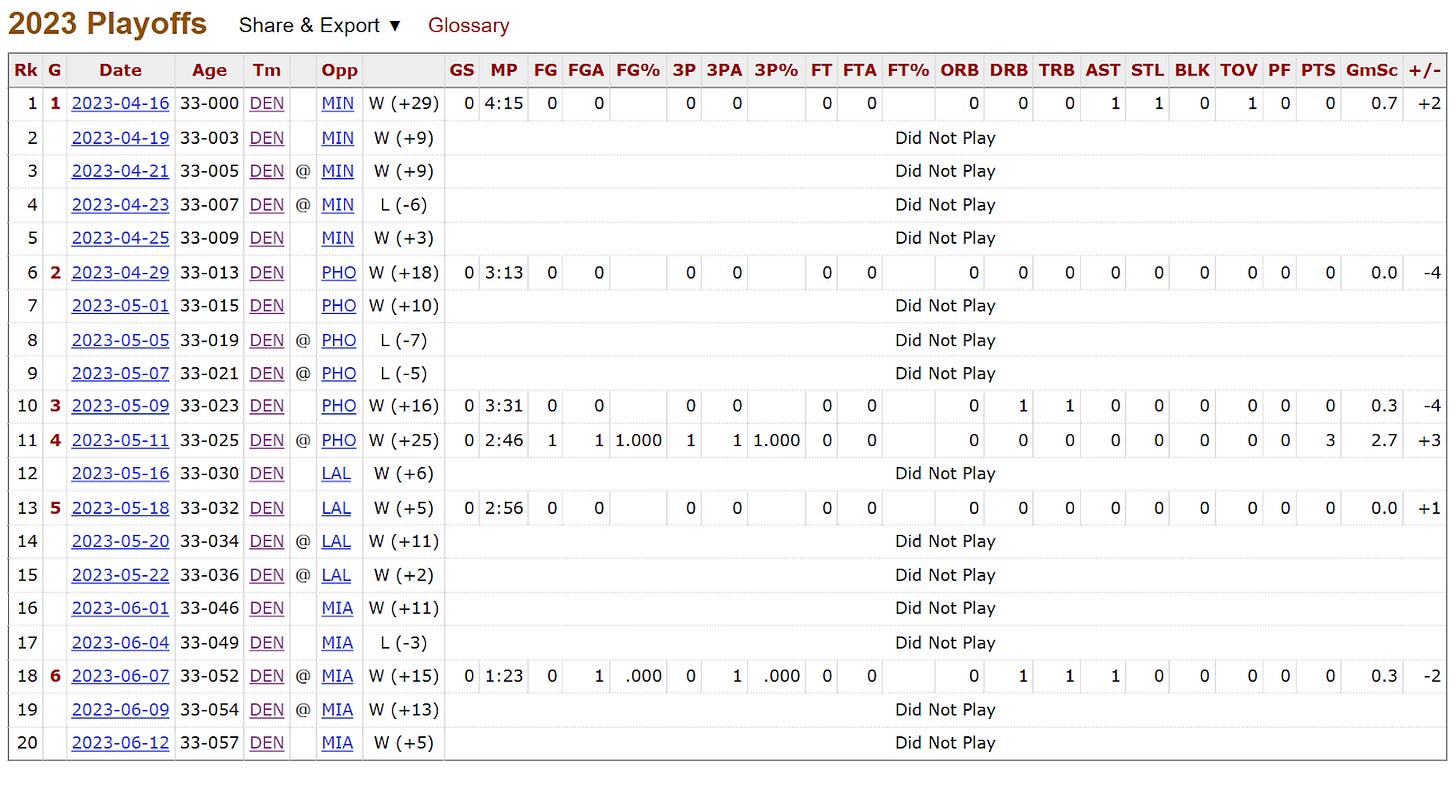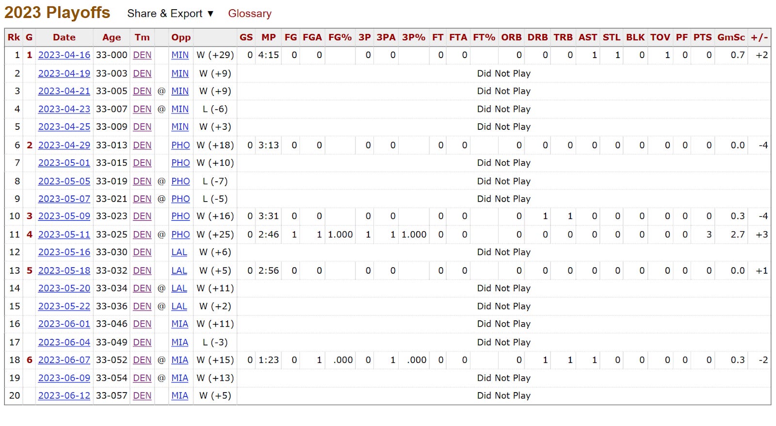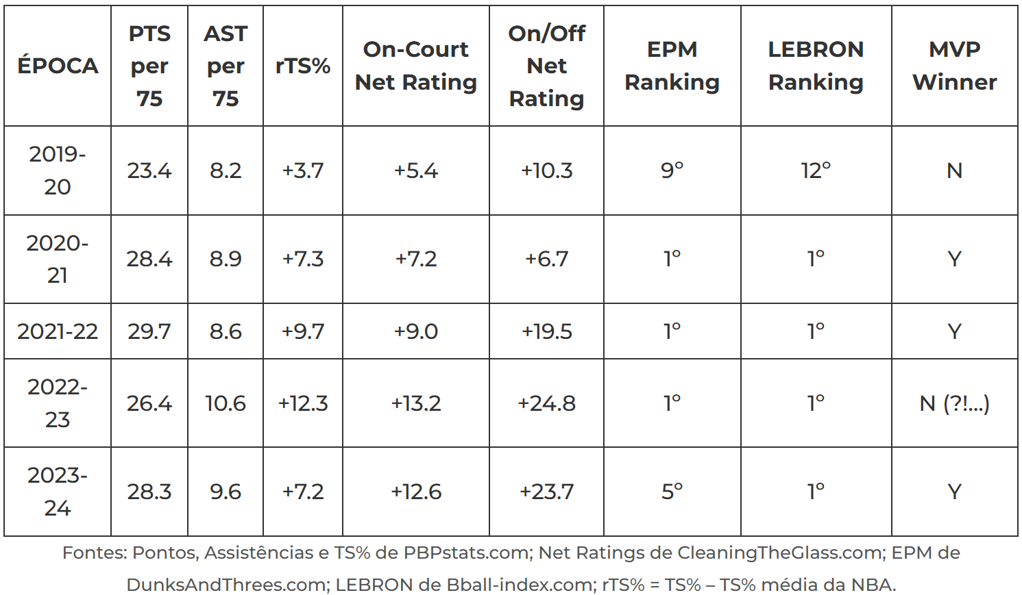 Não é exagero dizer que o valor adquirido nestes minutos foi decisivo na jornada para o título. Para comparação, os Nuggets foram piores três pontos por 100 posses de bola nos minutos com o Joker nos playoffs do que na época regular (+13,2 para +10,2).