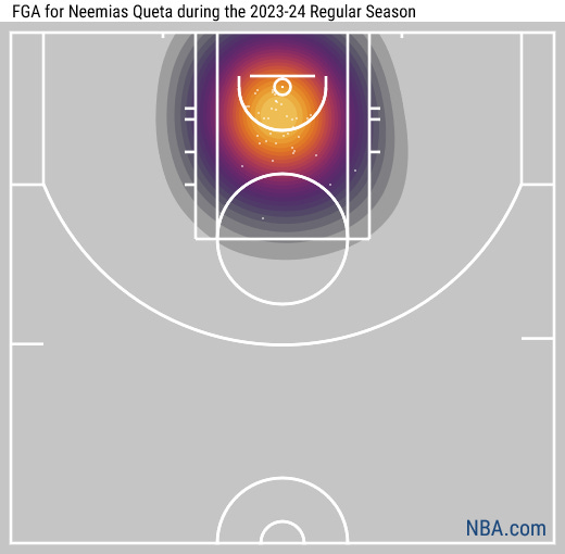 É raro ver um lançamento fora da zona do pintado por parte de Neemias Queta nesta altura da carreira e o gráfico mostra isso mesmo. A maioria dos lançamentos surge a partir de passe para finalização imediata debaixo do cesto, daí Neemias ser o segundo jogador com mais eficácia dos Celtics (atrás de Kornet), embora com mais tentativas de lançamento que Kornet.
