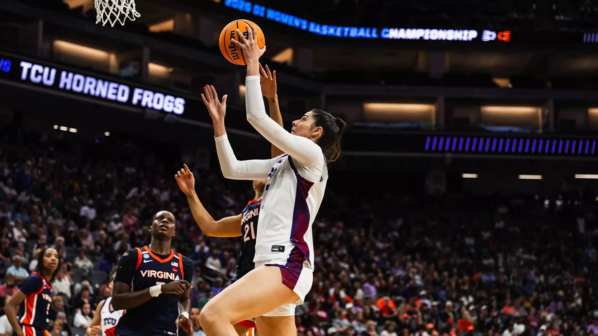 TCU bateu Virginia 79-69 no Sweet Sixteen com uma exibição dominante da base Olivia Miles (28 pontos, 10 ressaltos, 7 assistências) e da extremo espanhola Marta Suarez (33 pontos — máximo de carreira —, 10 ressaltos). Clara Silva contribuiu com 8 pontos, 8 ressaltos e 3 desarmes de lançamento numa vitória em que as Horned Frogs foram superiores no interior — 38-27 no total de ressaltos — e resolveram o jogo no terceiro período com um parcial de 17-4 que acabou com qualquer esperança de Virginia.