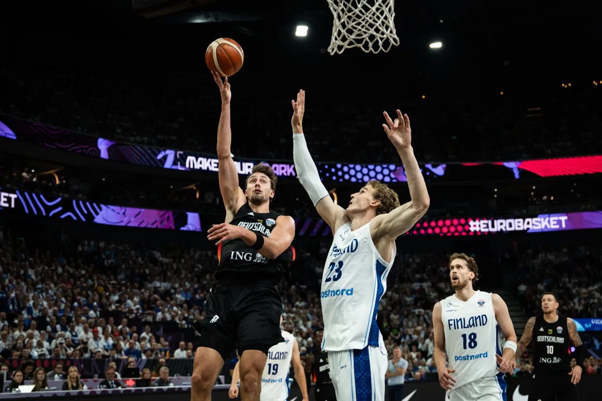 A campeã do mundo não deu hipóteses à Finlândia e venceu por 91-61 em Tampere, terminando invicta (5-0) a fase de grupos. Franz Wagner brilhou com 23 pontos, 7 ressaltos e 3 assistências em apenas 20 minutos, bem apoiado por Dennis Schröder (16 pontos, 7 ressaltos, 9 assistências). Olivier Nkamhoua (16+10) foi o melhor dos anfitriões, mas os alemães dominaram em todos os capítulos (57% de eficácia ao intervalo) e prolongaram a sua série perfeita no EuroBasket: 25 vitórias em jogos em que lideravam por 10 ou mais pontos ao descanso. A Finlândia segue em 3.º lugar, também apurada para os oitavos em Riga.