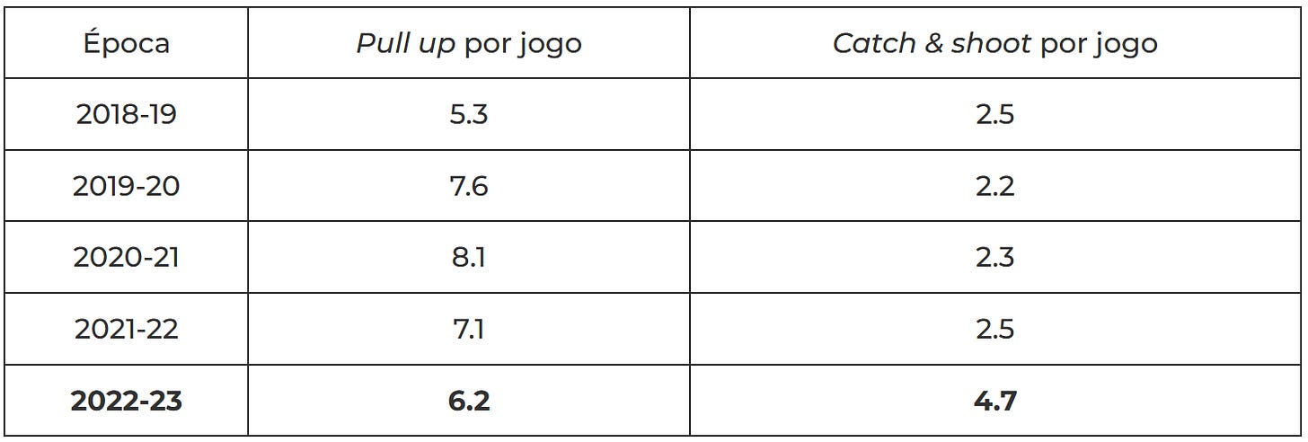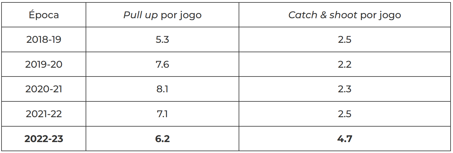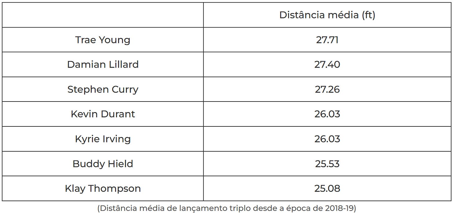 Mas se o par de jogadores que fez carreira em Golden State sempre existiu num ambiente desenhado para colocar a bola nas suas mãos já com uma abertura de lançamento, Lillard sempre teve de trabalhar muito mais com o próprio drible. A dependência de jogar em pick and roll tradicional ou em um contra um não é necessariamente problemática quando um jogador é tão talentoso nessas ações, mas certamente é um motivo pelo qual Lillard tem uma distância média de triplos muito superior à dos outros grandes shooters. É um problema exacerbado para um jogador mais pequeno, que precisa de criar mais espaço para libertar o lançamento.