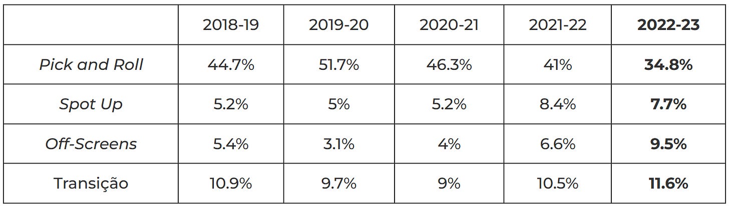 E olhando para a frequência das ações finalizadas por Lillard que são mais baseadas em movimento do jogador sem bola comparando com a sua habitual estratégia de pick and roll, as tendências apontam no mesmo sentido: