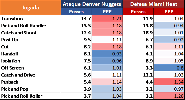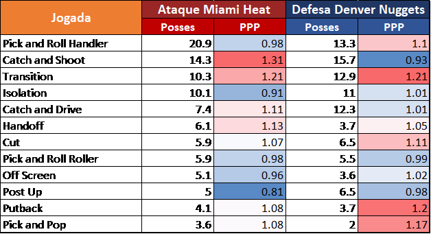 Um ataque que procura constantemente os seus pontos fortes e tem conseguido fazê-lo durante os playoffs, especialmente perto do cesto e no topo. Os Nuggets irão certamente procurar colocar Jokić nas zonas onde cria mais mossa (no centro, seja no topo ou mais perto do cesto) e usar a sua especial leitura de jogo para fazer os Heat pagarem.