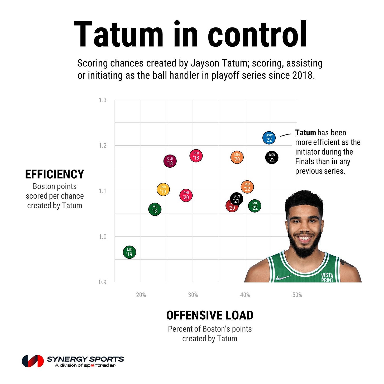 Durante os playoffs, apenas dois jogadores somaram mais front court touches do que Tatum: Nikola Jokić e Nikola Vučević. Ambos totalizaram 5 jogos, e Tatum já vai em 22. A bola tem estado nas mãos de Tatum, ele decide e, especialmente nas finais, tem decidido excecionalmente bem. Não só a lançar, mas sobretudo a distribuir.