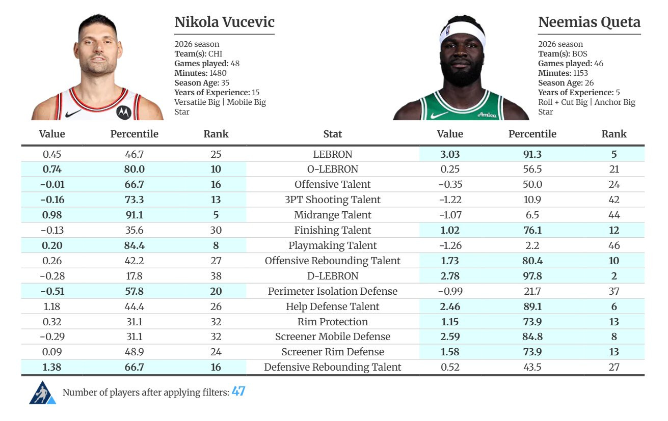 A comparação direta entre os dois postes evidencia o trade-off que Boston está a fazer: Neemias destaca-se pela proteção do aro e capacidade de bloqueio, enquanto Vučević traz capacidade de passe e espaçamento. São perfis opostos que servem propósitos diferentes — um ancora a defesa, o outro abre o ataque.