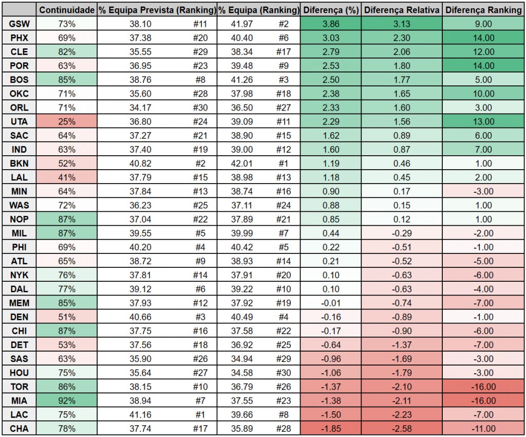 Tendo em conta que Toronto teve uma variação percentual menos negativa e menor continuidade de plantel, há argumentos suficientes para a tese de que os Heat foram a equipa que mais sofreu com a variação estatística dos seus lançadores de distância durante o ano… ou, em termos comuns, a que teve “mais azar”.