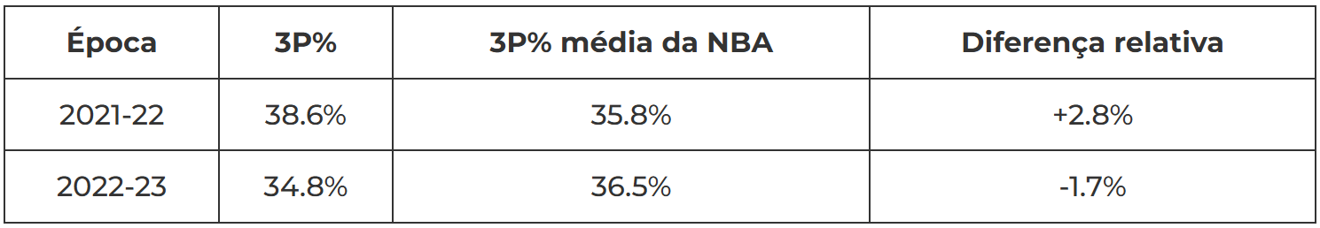 Esta não é uma afirmação sem fundo de verdade, pois a total falta de eficácia de longa distância afetou por completo o jogo ofensivo da equipa de Erik Spoelstra: Duncan Robinson desapareceu da rotação depois de protagonizar uma das mais inexplicáveis regressões enquanto especialista de três pontos, Kyle Lowry continuou a ver os anos retirarem impulso ao seu jumpshot, Max Strus apresentou percentagens abaixo da média. Parece que, qualquer que seja o jogador, invariavelmente foi uma época regular desapontante na que é a mais desejada habilidade no desporto.