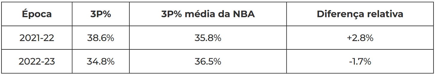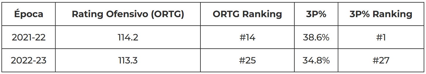 Em CleaningTheGlass.com, onde posses de bola classificadas como garbage time não são contabilizadas, podemos olhar a variação da última época com a que a precedeu ao nível do rating ofensivo da equipa, ou “pontos marcados por cada 100 posses de bola”, e da percentagem na região de três pontos: