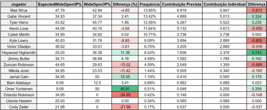 Mas tomando os resultados como uma aproximação razoável, vê-se de imediato que, mesmo com contribuições acima do esperado de Gabe Vincent e Tyler Herro, bastam apenas os números de Strus para afundar o top-3 de jogadores com maior frequência para uma região negativa.
