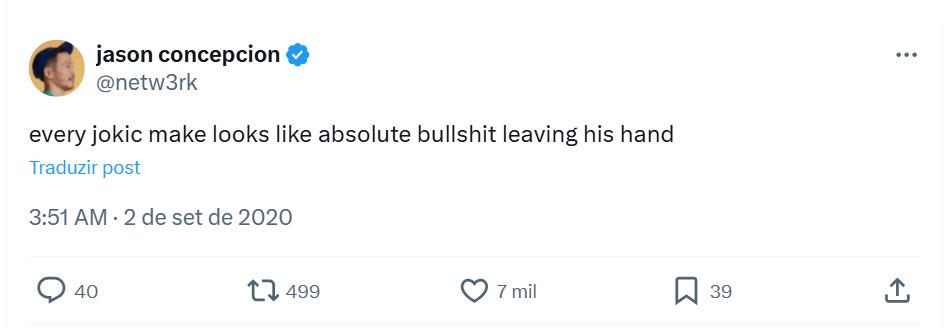 Escrevo-vos este artigo pouco depois de os Denver Nuggets eliminarem os Phoenix Suns em seis jogos. E com tantos pontos de interesse para acompanhar – o contraste entre a forma de Devin Booker nestes playoffs e a deprimente exibição no jogo de eliminação, os contínuos problemas dos Suns em aparecerem para jogos decisivos, a montanha-russa que é a eficiência ofensiva de Jamal Murray – dou por mim a pensar num tweet de Jason Concepcion e no quão surreal é a experiência de presenciar o talento invulgar de Nikola Jokić.