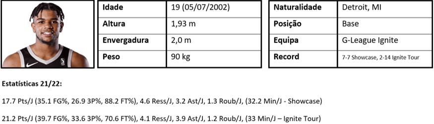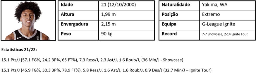 Com o Draft mesmo à porta, não o queria deixar, augusto leitor, sem mais uma salada de palavras sobre a classe que vai agora fazer a chamada. Optei por escrever sobre os mais iminentes prospects do projeto G League Ignite, que propositadamente omiti do meu anterior artigo, não por ter comido muito queijo, mas para incluir aqui. Mesmo sem nenhum candidato ao top-3, existe um trio interessante para a lottery. Não vou falar de dois jogadores: Scoot Henderson e Michael Foster Jr. O primeiro, maior candidato a usurpar o Wemby da posição #1 em ’23, por não ser elegível; o segundo, porque não me apetece. Estando tudo dito, vamos principiar!