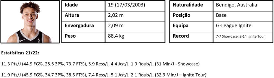 Apesar de uma postura discreta fora de campo e um jogo pouco vistoso dentro dele, o aussie Dyson Daniels apresenta-se como o prato principal da leva de 2022 da Ignite Team, tendo disparado nos boards, muito à boleia de uma inteligência acima da média e de uma evolução física incomum (sempre difícil confirmar, mas diz-se que pode ter crescido ≈5 cm desde o início da temporada).