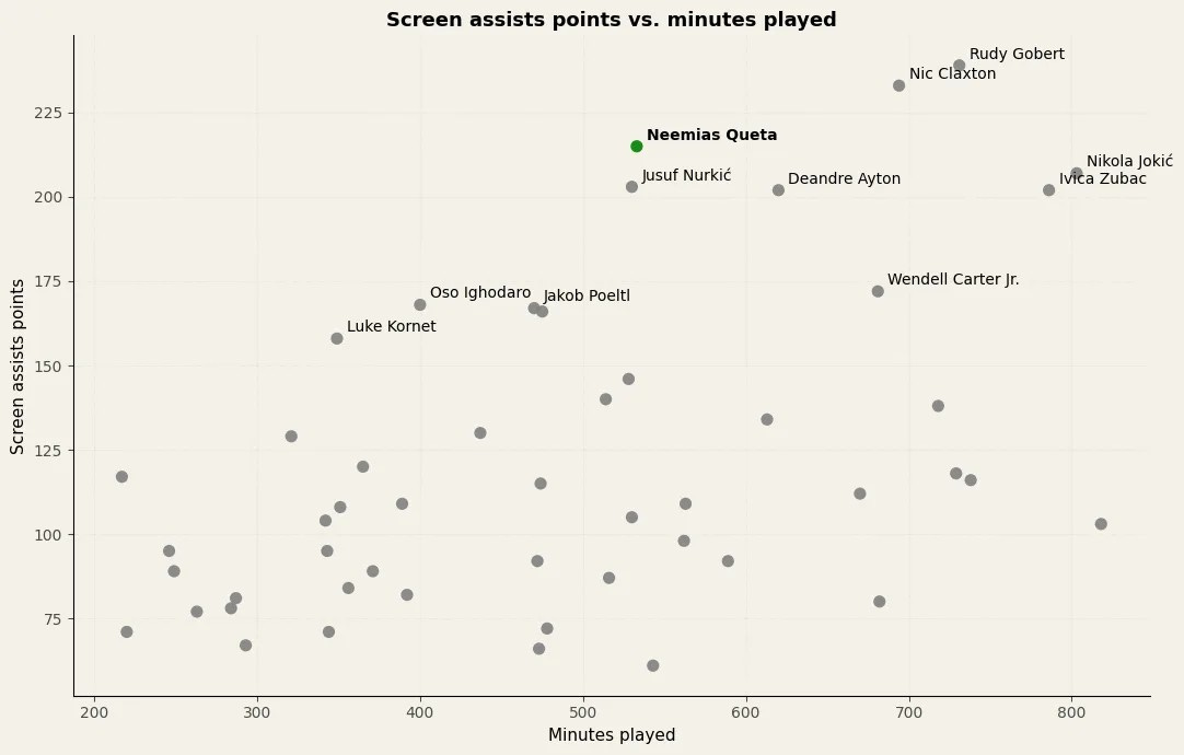 Ao mesmo tempo, a forma como Neemias cria vantagens sem lançar muito encaixa perfeitamente nas necessidades da equipa. Num texto recente no Celtics Blog sobre a vitória em Toronto, o analista Azad Rosay sublinhava que o poste português “pode ser, neste momento, o melhor bloqueador da NBA”. O gráfico usado no artigo mostrava Neemias como um dos jogadores da liga com mais pontos gerados por screen assists em relação ao tempo de utilização. Frente aos Raptors, ajudou a produzir 19 pontos a partir de bloqueios.