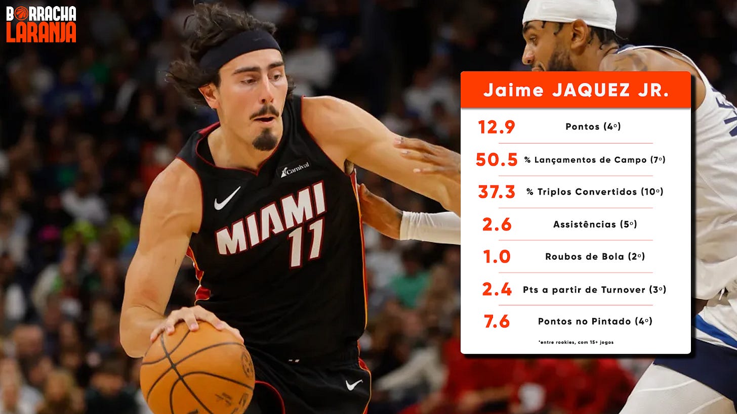 Ofensivamente, Erik Spoelstra já confia no jovem para criar, seja a partir do poste ou do bloqueio direto. Sem esquecer as leituras que Jaquez faz sem bola, aparecendo no sítio e momento certos a cortar para lançamentos fáceis e espaçando bem o campo, com capacidade no tiro exterior. Tudo isto leva Jaime a ser o 4.º rookie em pontos, o 7.º em percentagem de lançamentos de campo e o 10.º em percentagem de triplos convertidos.