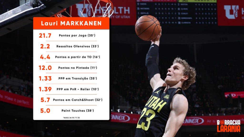 Como roller no bloqueio direto, Markkanen é o 10.º da liga em pontos por posse (PPP). Com leitura apurada do espaço, recebe já depois de “vistoriar” a área e decide em função disso. A mobilidade, a explosividade a partir de um pé e a capacidade de contorção ajudam.