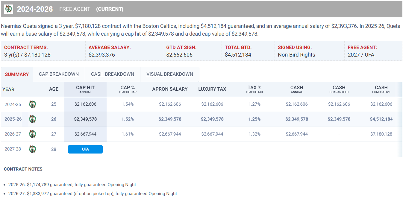 O salário de Neemias Queta para 2025-26 é de 2.024.277 euros (2.349.578 dólares) e ficou totalmente garantido na Opening Night. De acordo com o site Spotrac, o acordo de três anos com os Celtics totaliza 6.186.033 euros (7.180.128 dólares), com 3.887.468 euros (4.512.184 dólares) garantidos, assinado via Non-Bird Rights, e coloca o português como unrestricted free agent em 2027.