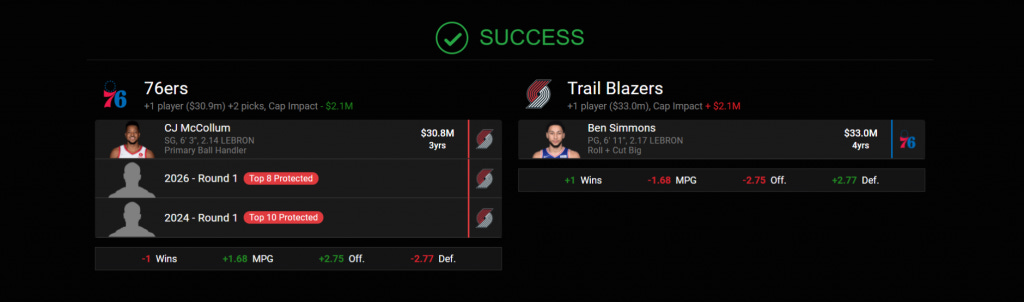 Blazers: Chauncey Billups tem experimentado com a defesa numa tentativa de tornar a equipa mais competitiva desse lado. Um dos grandes problemas defensivos é um backcourt com, digamos, pouca apetência para defender. Substituir CJ por Ben faria maravilhas pela defesa ao mesmo tempo que mantém, no cinco, pelo menos um playmaker não chamado Dame Lillard. Há anos se fala da separação Dame/CJ. Ben Simmons seria um retorno que justificaria considerar esse cenário até agora rejeitado.
