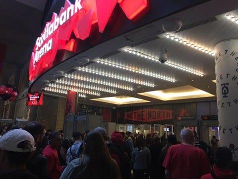 17h47. Estou na fila da minha porta, um mar de gente (a política de máscaras no Ontario é a mesma da de Lisboa, actualmente). Gate 1, por dentro da Union Station, o ambiente é de festa: quem não soubesse quanto estava, acharia que eram os Raptors na frente da série por 3-2. Um segurança, de megafone em riste para manter a ordem nas filas, anuncia que hoje é para o empate, e que tem uma sobrinha que viu o Harden na véspera num clube de diversão nocturna. Está no papo.