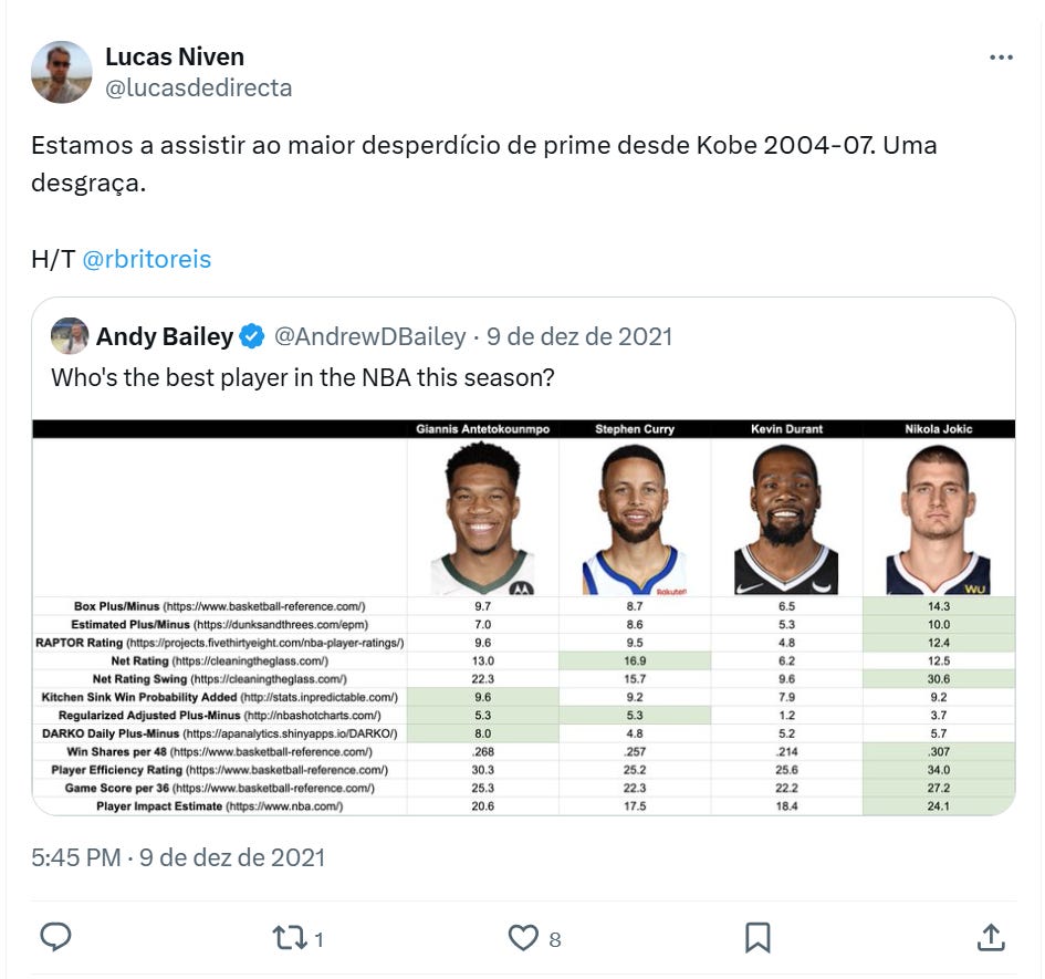 E o que dizer dos Lakers? Por esta altura, é já evidente para todos que trocar os minutos na asa de KCP e Kuzma por Westbrook foi asneira grande, apenas suplantada pelo erro de deixar Alex Caruso sair com um obrigado e uma palmada nas costas. O que sobrou foi uma equipa completamente estrangulada na folha salarial, sem caminho para apresentar uma defesa razoável. O front office dos Lakers decidiu abandonar a fórmula ‘LeBron + AD + peças que permitam ao Vogel montar uma defesa’, que os tornou campeões há apenas 15 meses, e decidiu trocar a última parcela por ‘contratos mínimos que hão-de meter uns triplos’. Isso não vai ser suficiente em LA, e a subtil passagem neste contexto de LeBron de jogador top-3 da liga para top-5/10 e de AD de top-5/10 para top-25 desde os tempos da bolha não ajuda. É jogar esta época até ao fim e entrar na lotaria de Verão outra vez.