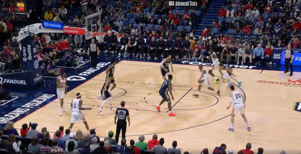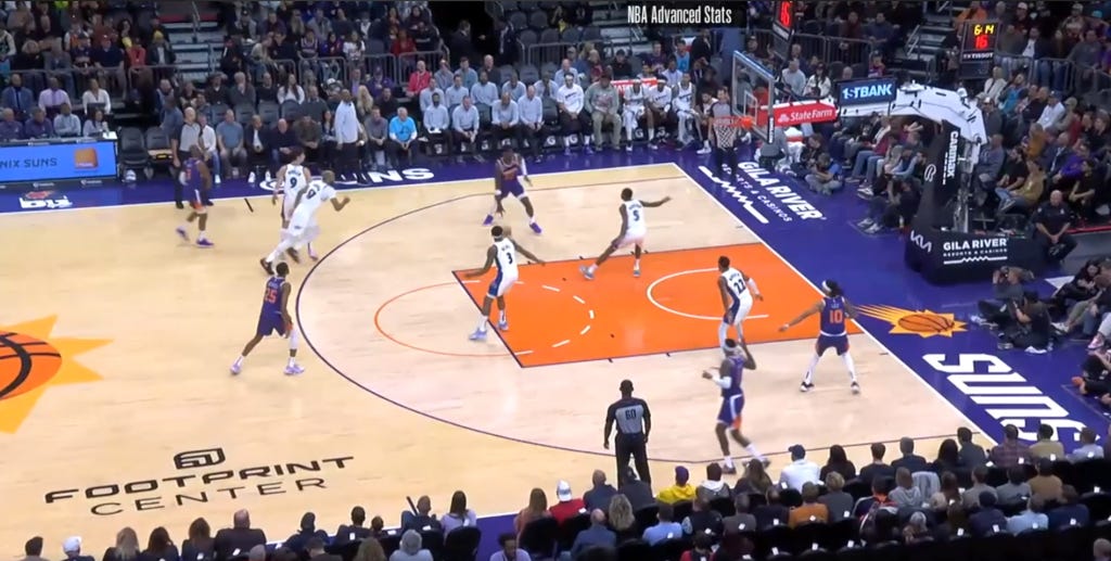 Os Suns parecem estar a usar Spain Pick and Rolls menos frequentemente esta época, mas a ideia de usar Durant para o backscreen pode facilmente levar a que os dois defensores acabem por se comprometer ao mesmo jogador quando ele e Ayton se cruzam no pintado.