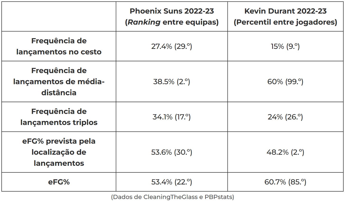 Há também características do lado de Phoenix que imediatamente vão de acordo ao estilo de jogo que o próprio KD procura. Por um lado, Durant tem desenvolvido a sua capacidade de passe e movimentação de bola; Phoenix, por sua vez, segundo o tracking da NBA, está no top-4 em Potenciais Assistências e no mais pequeno ratio entre o número de passes e o número de assistências – apenas Golden State, uma casa que em tempos Kevin escolheu em parte pelo seu estilo de basquetebol, também se encontra no top-4 em ambos.